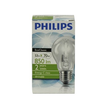 De Philips EcoClassic halogeenlamp helder E27 53W (= 70W) is een peervormige halogeenlamp geschikt voor een E27 fitting. De lamp heeft een vermogen van 53 watt, hiermee heeft de lamp een lichtopbrengst van 850 lumen. Het heldere, warm witte licht van deze lamp heeft een natuurlijke uitstraling waarin de kleuren van je interieur goed tot hun recht komen. Ook heeft de lamp een levensduur van 2000 uur, twee keer zo lang als een standaard lamp. Met deze lamp heb je dus sprankelend licht in de vertrouwde vorm, met een langere levensduur. De lamp schijnt direct met maximale helderheid. Tevens kun je de lamp dimmen, waardoor je gemakkelijk de hoeveelheid licht kunt bepalen.
