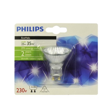 De Philips EcoHalo halogeenspot GU10 25W (= 30W) is geschikt voor een GU10 fitting. De spot heeft een vermogen van 18 watt, hiermee heeft de spot een lichtopbrengst van 165 lumen. Het heldere, warm witte licht van deze spot heeft een natuurlijke uitstraling waarin de kleuren van je interieur goed tot hun recht komen. Dankzij de reflector creëert de spot gerichte, heldere lichtbanen, waardoor je gemakkelijk lichtaccenten kunt aanbrengen. De spot heeft een lichthoek van 25 graden. Ook heeft de spot een levensduur van 2000 uur, twee keer zo lang als een standaard lamp. De spot schijnt direct met maximale helderheid. Tevens kun je de spot dimmen, waardoor je gemakkelijk de hoeveelheid licht kunt bepalen.