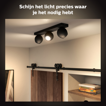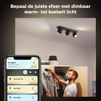 De zwarte Philips Hue Buckram 3-lichts opbouwspot bestaat uit een rechthoekige basisplaat met drie verstelbare, bolvormige spots naast elkaar. Deze zijn allemaal voorzien van een White ambiance LED-lamp die keuze biedt uit warm tot koelwit licht. Daarmee ben je dus voorbereid op elke situatie, van lekker ontspannen tot geconcentreerd lezen. Je kunt de spots gemakkelijk in- en uitschakelen en dimmen via de meegeleverde Philips Hue dimmer switch of via de handige Hue app. Wil je nog meer slimme mogelijkheden? Verbind dan de lamp met de los verkrijgbare Philips Hue Bridge die toegang biedt tot alle Hue functies, zoals timers en routines.