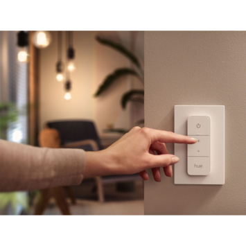 De Philips Hue dimmer switch is een ontzettend slimme schakelaar voor je Hue lampen. Zet je lampen feller, dim ze, blader door lichtscènes of stel het licht in dat het beste past bij het moment van de dag. Je kunt deze slimme schakelaar gemakkelijk aan de muur bevestigen of de magnetische achterkant gebruiken. Of schroef de wandhouder op de muur om een bestaande lichtschakelaar te vervangen. De wandhouder is breed genoeg zodat je hem mooi kan wegwerken over je bestaande schakelaaropening, zonder rare rafelrandjes. En hij werkt helemaal draadloos! Haal de dimmer switch eenvoudig van de wandhouder en gebruik hem als handige afstandsbediening om je slimme lampen te bedienen. Heb je al een Hue Bridge? Dan kun je via de Hue app de instellingen van de dimmer switch helemaal naar smaak aanpassen, precies zoals jij het wil.