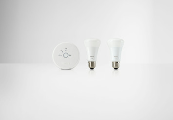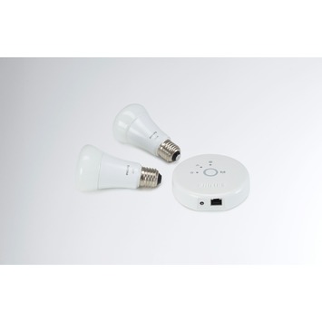 Starterspakket Het starterspakket bevat twee Hue Lux-lampen en een Bridge. Hue Lux-lampen passen in je bestaande fittingen. Je schroeft de lampen eenvoudigweg in de fittingen en doet het licht aan met de wandschakelaar. Vervolgens schakel je de Bridge in. Met behulp van de meegeleverde netwerkkabel sluit je de Bridge aan op je modem of router. Wacht even tot de drie led-lampjes op de Bridge gaan branden. Download vervolgens de gratis Hue-app op je smartphone of tablet en koppel je apparaat met de Bridge. Daarna zoek je de lampen en geeft ze een naam. Nu kun je ze heel gemakkelijk bedienen. Je kunt tot 50 lampen aan je systeem toevoegen.