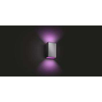 De Philips Hue Resonate white and color ambiance muurlamp in roestvrij staal zorgt voor lichtkegels in 16 miljoen kleuren op de gevel van je huis. Dat komt omdat de LED-Lamp zowel omhoog als omlaag op de muur schijnt. Door de slimme lamp te koppelen met je Philips Hue Bridge ontstaan er nieuwe mogelijkheden. De bediening gaat nu gemakkelijk en eenvoudig met de Hue app op smartphone of tablet, ook als je niet thuis bent. Bovendien kun je timers en lichtscènes instellen. En je kunt gebruik maken van geofencing. Dat betekent dat je buitenverlichting automatisch aangaat als het je het huis nadert. De Hue Resonate is spatwaterdicht en dus perfect voor gebruik buitenshuis dankzij zijn IP44-classificatie.
