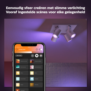 Hue White and Color Ambiance lampen en armaturen maken gebruik van warm wit tot koel daglicht en tot wel 16 miljoen kleuren. Met deze slimme lampen, die kunnen worden gedimd tot subtiele nachtlampjes, kun je het juiste sfeerlicht instellen voor ieder moment. Met Energieklasse A+ en gemiddeld 15.000 branduren is het een zeer duurzame lamp.