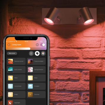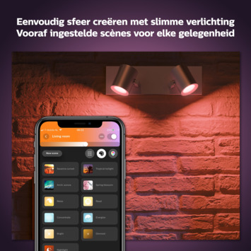 Hue White and Color Ambiance lampen en armaturen maken gebruik van warm wit tot koel daglicht en tot wel 16 miljoen kleuren. Met deze slimme lampen, die kunnen worden gedimd tot subtiele nachtlampjes, kun je het juiste sfeerlicht instellen voor ieder moment. Met Energieklasse A+ en gemiddeld 15.000 branduren is het een zeer duurzame lamp.