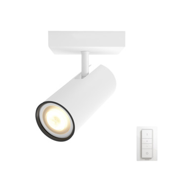 De witte Philips Hue Buratto 1-lichts opbouwspot bestaat uit een vierkante montageplaat en een ronde verstelbare spot die is voorzien van een White ambiance GU10 LED-lamp. Het licht daarvan kun je regelen van warm- tot koelwit om je te helpen ontspannen, lezen, concentreren en energie opdoen. Je kunt de lamp, ook als je van huis bent, bedienen vanaf een smartphone of tablet met de Philips Hue app. Die werkt via de afzonderlijk verkrijgbare Philips Hue Bridge. Je beschikt zo over alle slimme functies, zoals timers en routines. Met de meegeleverde Philips Hue dimmer switch kun je kiezen tussen de voorgeprogrammeerde lichtstanden, je lamp dimmen en in- en uitschakelen.