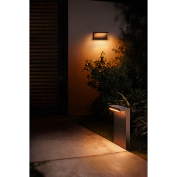 Onbegrensde mogelijkheden. Voor buitengewone ervaringen. De Philips Hue Nyro white and color ambiance sokkellamp verlicht je tuinpad of oprit in alle kleuren van de regenboog. De LED-lamp geeft namelijk 16 miljoen kleuren en 50.000 wittinten. De zwarte sokkellamp werpt zijn licht rechtstreeks op de grond en dat geeft een subtiel en mooi lichteffect. Als je de slimme lamp koppelt aan je Philips Hue bridge kun je elke gewenste kleur van je tuinpad voorprogrammeren. Je kunt de lampen dan bedienen met de Hue app via smartphone of tablet, ook als je niet thuis bent. En verder kun je gebruik maken van slimme verlichtingsmogelijkheden zoals timers en geofencing, waardoor je lampen automatisch gaan branden als je in de buurt komt. De Hue Nyro heeft bovendien een IP44 waterdicht beschermingsniveau.. Onbegrensde mogelijkheden. Schilder je buitenruimte. Met Philips Hue buitenverlichting bestaan er geen grenzen aan de magie die je kunt toevoegen. Speel met 16 miljoen kleuren en alle tinten wit licht om het gewenste effect te creëren. Accentueer objecten, bomen of paden om je ruimte te laten opvallen. Gebruik de Hue App om je favoriete lichtinstellingen op te slaan en naar believen weer op te roepen met een druk op de knop.. Goed thuiskomen met licht. Stel je Philips Hue app zo in dat je verlichting weet wanneer je bijna thuis bent. Nog voordat je uit de auto stapt of het tuinpad op loopt, gaan de door jou geselecteerde slimme lampen automatisch aan.. Eenvoudige bediening en comfort. Bedien het op jouw manier. Verbind je Philips Hue lampen met de bridge en ontdek de eindeloze mogelijkheden. Bedien de lampen vanaf je smartphone of tablet via de Philips Hue app of voeg binnenschakelaars toe aan het systeem om de verlichting aan te passen. Voor een complete beleving van Philips Hue kun je timers, waarschuwingen, alarmen en nog veel meer instellen. Philips Hue werkt ook met Amazon Alexa, Apple HomeKit en Google Assistent, zodat je de lampen met je stem kunt bedienen.. Volledige bediening via smartphone of tablet met de Hue bridge. Philips Hue bridge vereist. Verbind je Philips Hue lampen met de Hue bridge en bedien ze via de Philips Hue app op je smartphone of tablet. Je kunt je Philips Hue lampen ook in- en uitschakelen of dimmen met de Philips Hue dimmer switch.. Speciaal ontworpen voor buiten. Weerbestendig (IP44). Dit Philips Hue buitenarmatuur is speciaal ontworpen voor gebruik in buitenomgevingen en is uitvoerig getest. Het IP-niveau wordt aangegeven met twee cijfers: het eerste cijfer geeft het beschermingsniveau tegen stof aan en het tweede cijfer geeft de vochtbestendigheid aan. Deze lamp is met IP44 ontworpen: hij is spatwaterdicht vanuit alle richtingen. Hierdoor is hij ideaal voor algemeen gebruik buitenshuis.