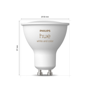 Haal een echte sfeermaker in huis met de Philips Hue White and color ambiance LED-spot met GU10-fitting. Je hebt keuze uit 16 miljoen prachtige kleuren en 50.000 wittinten om voor elk moment de juiste sfeer te creëren. Zo ontspan je met warmwit licht en gebruik je koelwit licht voor extra focus. Je kunt de lamp eenvoudig in- en uitschakelen of moeiteloos dimmen met de Philips Hue app op je smartphone of tablet. Wanneer je verbinding maakt met de Hue Bridge krijg je toegang tot alle beschikbare slimme verlichtingsfuncties, zoals het personaliseren van lichtscènes, het instellen van timers en voeg accessoires toe, zoals bewegingssensoren en slimme draadloze schakelaars.