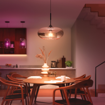 Geniet van de magie van licht met deze losse Philips Hue White and color ambiance standaardlamp. Met deze slimme LED-lamp met E27-fitting beleef je licht als nooit tevoren! Stel elke kleur of wittint in die je maar wil en creëer altijd de perfecte sfeer. Stel warmwit licht in als je wil ontspannen, koelwit licht als je even wat meer focus nodig hebt of kies een van de 16 miljoen prachtige kleuren om je interieur extra bijzonder aan te kleden. Deze dimbare lamp is bijzonder geschikt voor grote ruimtes waar je krachtig licht nodig hebt, zoals je keuken of thuiskantoor. Met 1600 lumen geeft deze lamp namelijk evenveel licht als een oude gloeilamp van 100 W. Met de Bluetooth-functie en de bijbehorende app bedien je tot wel 10 lampen en stel je in een handomdraai alle lampen in op feller licht, gedimd licht of een van de voorgeprogrammeerde lichtrecepten. Wil je toegang tot alle slimme functies, zoals timers, automatiseringen of bediening van je verlichting als je niet thuis bent, breid je lampen dan uit met een Hue Bridge.