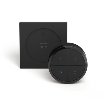 Maak je huis nu nog slimmer en bedien tot wel drie Kamers of Zones met elke afzonderlijke knop van deze stijlvolle zwarte Philips Hue Tab dial switch. Pas eenvoudig de helderheid van je Hue lampen aan mits een simpele draai aan de knop. Bevestig de Tap dial switch aan je muur, plaats hem op een magnetisch oppervlak of gebruik hem als afstandsbediening. Deze draadloze installatie bezorgt je een snelle toegang tot alle lichtscènes.