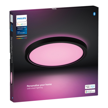 Door zijn slanke en strakke ontwerp is deze zwarte, ronde Hue Tento plafondlamp Ø30 cm ideaal voor ruimtes zoals de woonkamer, keuken of slaapkamer. Met de White and color ambiance lamp heb je keuze uit 16 miljoen prachtige kleuren en 50.000 wittinten. Zo heb je het juiste licht voor elk moment. Je kunt de lamp eenvoudig in- en uitschakelen of moeiteloos dimmen met de Philips Hue app op je smartphone of tablet. Wanneer je verbinding maakt met de Hue Bridge krijg je toegang tot alle beschikbare slimme verlichtingsfuncties, zoals het personaliseren van lichtscènes, het instellen van timers en voeg accessoires toe, zoals bewegingssensoren en slimme draadloze schakelaars.