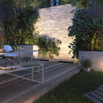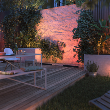 Met zijn langwerpig ontwerp, schijnt de Philips Hue Amarant verstraler gelijkmatig licht op grote objecten zoals muren, hekken en hagen. Creëer zo de mooiste lichteffecten met warme en koele wittinten, maar ook met miljoenen kleuren licht en verander jouw buitenomgeving naar een sfeervolle oase. De Amarant werkt op laagspanning. Dat wilt zeggen dat je de lamp met een voeding kan aansluiten op elk stopcontact. Bovendien kan je meerdere Amarants met elkaar verbinden met slechts één voeding, waardoor er een zee van licht ontstaat. Dankzij het ingenieuze design schijnt het licht eerst naar boven en dan naar buiten, waardoor een gelijkmatige spreiding van licht over een groter gebied ontstaat. Verblinding wordt zo uitgesloten. Installeer de Amarant op de grond of bevestig hem hoog op een verticaal oppervlak om een uitgestrekter gebied perfect uit te lichten. Wanneer je de LED-lamp verbindt met je Philips Hue Bridge, wordt de Amarant opgenomen in je totale slimme verlichtingssysteem. Zo krijg je via de Philips Hue app op jouw smartphone of tablet toegang tot allerlei functies – van bediening als je niet thuis bent tot timers en geofencing-technologie. Dat betekent dat de buitenverlichting automatisch aangaat als je je huis nadert. De Amarant is ontworpen met IP65-classificatie en dus waterdicht. In de doos vind je ook een kabel om aan te sluiten op de laagspanningsvoeding van de buitenverlichting die je al hebt. Begin je met Hue buitenverlichting en heb je nog geen voeding, dan is die los verkrijgbaar in 40W of 100W.