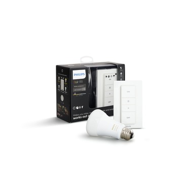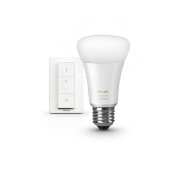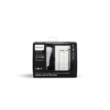 Vloeiend draadloos dimmen. De Philips hue draadloze dimmerset combineert een intelligente draadloze dimmer met een Philips hue white LED-lamp E27 (grote fitting ) 9,5W. Geen installatie nodig. Zet de schakelaar neer waar je wilt en gebruik hem als afstandsbediening.
