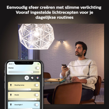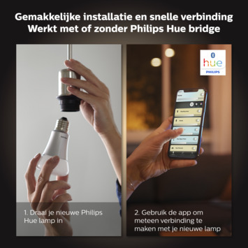 De bediening gaat zeer eenvoudig via de Philips Hue Bluetooth app op een smartphone of tablet. Hiermee zijn tot wel 10 lampen in- en uit te schakelen, en te dimmen. De handige Hue Bluetooth-app bediend Hue lampen in elke kamer van het huis. Voeg tot wel 10 slimme lampen toe en bedien ze allemaal door gewoon op een knop op je mobiele apparaat te tikken.