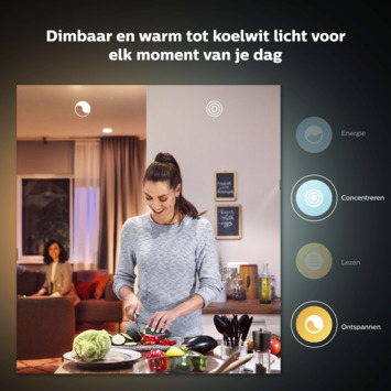 Hue White Ambiance lampen en armaturen maken gebruik van warm wit tot koel daglicht. Met deze slimme lampen, die kunnen worden gedimd tot subtiele nachtlampjes, kun je het juiste lichtniveau instellen voor elk moment. Met Energieklasse A+ en gemiddeld 25.000 branduren is het een zeer duurzame lamp. De kleurtemperatuur is afhankelijk van de gekozen instelling tussen de 2200K en 6500Kde lichtopbrengst is 806 lumen (bij 4000K).