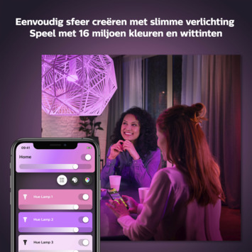 Hue White and Color Ambiance lampen en armaturen maken gebruik van warm wit tot koel daglicht en tot wel 16 miljoen kleuren. Met deze slimme lampen, die kunnen worden gedimd tot subtiele nachtlampjes, kun je het juiste sfeerlicht instellen voor ieder moment. Met Energieklasse A+ en gemiddeld 25.000 branduren is het een zeer duurzame lamp. De kleurtemperatuur is afhankelijk van de gekozen instelling tussen de 806K en 4000Kde lichtopbrengst is 806 lumen (bij 4000K).