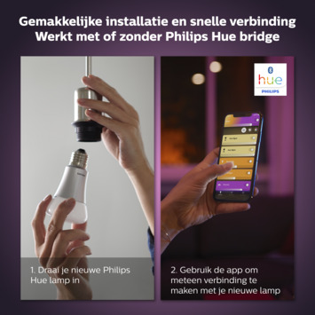 De bediening gaat zeer eenvoudig via de Philips Hue Bluetooth app op een smartphone of tablet. Hiermee zijn tot wel 10 lampen in- en uit te schakelen, en te dimmen. De handige Hue Bluetooth-app bediend Hue lampen in elke kamer van het huis. Voeg tot wel 10 slimme lampen toe en bedien ze allemaal door gewoon op een knop op je mobiele apparaat te tikken.