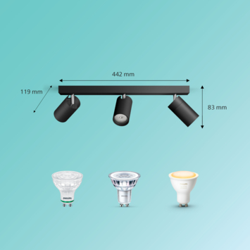 Lampen worden niet meegeleverd, zodat je zelf je verlichting kunt kiezen. Ga voor een Ultra Efficient GU10 spot, een SceneSwitch-spot of slimme Philips Hue verlichting. De spots zijn geschikt voor LED-verlichting tot maximaal 5 W per spot.