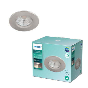 De moderne Philips Dive badkamerinbouwspots in nikkelkleur bieden een eigentijdse aanblik en zijn ook nog eens praktisch. Combineer de LED-spots met een geschikte dimmer en speel met de lichtintensiteit: helemaal aan bij het opmaken of scheren, gedimd als u wat sfeer wilt creëren. De inbouwspotjes bieden volgens hun IP65-classificatie bescherming tegen binnendringend vocht en zijn in de meeste standaard verlaagde plafonds te monteren, ook recht boven de douche of het bad.