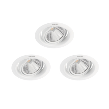 De drie witte Philips Pomeron inbouwspotjes zijn een opvallende verschijning en geven hoogwaardig, warmwit licht. De energiezuinige 7W LED-lichtbron heeft verschillende lichtstanden, waarmee u de spotjes kunt dimmen of feller kunt zetten met uw standaard lichtknop. Gebruik deze verstelbare spotjes als u een mooi detail in uw interieur extra wilt laten opvallen.