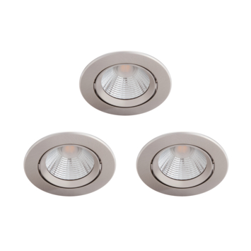Deze drie nikkelkleurige Philips Sparkle inbouwspotjes ogen modern. Het gelijkmatige, warmwitte LED-licht is zeer krachtig, ideaal om een mooi kunstwerk uit te lichten. Door de speciale lichtbron geven deze inbouwspots bredere lichtstralen dan de meeste andere spots. Wilt u wat minder licht? Combineer de spotjes met een geschikte dimmer en geniet van de sfeer. Door de beperkte hoogte kunnen de verstelbare spotjes in bijna elk verlaagd plafond worden weggewerkt.