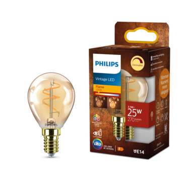 Met deze Philips LED filamentlamp zorg je voor extra sfeer in huis. Ze zorgen voor een stijlvol lichtelement en geven sfeervol warmwit licht. Deze lamp heeft een gouden coating en in de lamp zie je een dimbare lichtspiraal, wat doet denken aan gloeilampen van vroeger. Met EyeComfort, voor licht dat aangenaam is voor jouw ogen. De lamp heeft een E14-fitting, en past dus in de meeste lampen met kleine fitting.
