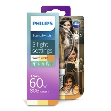 Dimmen zonder dimmer met de Philips SceneSwitch lampen en je eigen lichtschakelaar. Met je bestaande lichtschakelaar schakel je eenvoudig van helder functioneel licht naar natuurlijk ontspannend licht of een zacht, warm sfeerlicht. Dankzij het automatisch geheugen onthoudt de Scene Switch lamp je laatste instelling als de lichtschakelaar langer dan 6 seconden wordt uitgeschakeld.