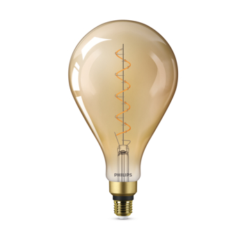 De Philips LED-classic Giant druppel Ø 18,5 cm goud is een super trendy lamp, geheel van deze tijd. Het mooie grote formaat in combinatie met het 'gouden' glas maken van deze lamp een ware eye-catcher binnen jouw interieur. Het bewerkte glas zorgt voor een warm licht-effect en creërt direct een fijne sfeer. Dankzij het heldere glas is het filament goed te zien en is deze lichtbron decoratief te gebruiken met bijvoorbeeld alleen een pendel. De Giants verbruiken zo’n 80% minder energie dan de klassieke gloeilampen dankzij de laatste nieuwe energiebesparende LED-technologie en gaan tien keer langer mee.
