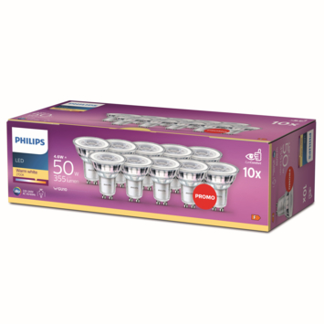 Vervang 10 oude spotlampen door deze nieuwe energiezuinige Philips LED-spots, met koelwit licht, en bespaar tot €30 op energiekosten per lamp per jaar. Deze standaardlampen verbruiken tot 90% minder energie dan gloei- en halogeenlampen dankzij de nieuwste energiezuinige LED-technologie. Daarnaast gaan ze gaan tien keer langer mee. Met EyeComfort, voor licht dat aangenaam is voor jouw ogen. Deze lampen hebben een GU10-fitting en gaan vaak perfect samen met jouw in- of opbouwspots.