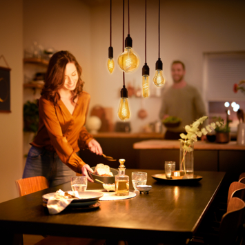 Met deze Philips LED filamentlamp zorgt u voor extra sfeer in huis. Ze zorgen voor een stijlvol lichtelement en geven sfeervol warmwit licht. Deze lamp heeft een gouden coating en in de lamp zie je een dimbare lichtspiraal, wat doet denken aan gloeilampen van vroeger. Met EyeComfort, voor licht dat aangenaam is voor uw ogen. De lamp heeft een E14-fitting, en past dus in de meeste lampen met kleine fitting.