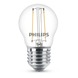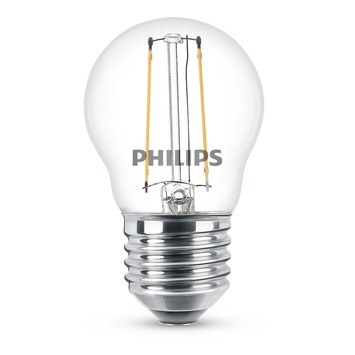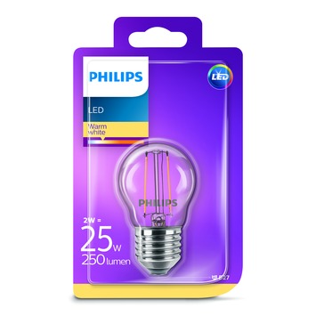 De Philips LED kogel E27 2W(=25W) 250lm warm wit is een subtiele led lichtbron die past in armatuur met een E27 (grote) fitting. Deze energie zuinige lichtbron verbruikt tot 80% minder energie dan de traditionele gloeilamp en gaat tot 15000 lichturen mee. Draai deze lichtbron in een hanglamp of vloerlamp en geniet van het heldere warm witte licht.