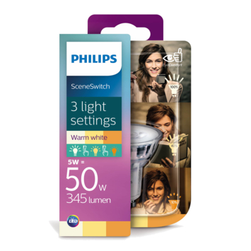 Met de Philips SceneSwitch LED-spot kunt u met uw bestaande schakelaar eenvoudig het lichtniveau aanpassen, van helder licht naar natuurlijk licht of een sfeervolle, warme gloed. U hebt geen dure dimmer of aanvullende installatie nodig. Bovendien heeft deze lamp een geheugenstand; daardoor onthoudt de lamp de laatste lichtstand, wanneer u de lamp voor langere tijd heeft uitgeschakeld. Met EyeComfort, voor licht dat aangenaam is voor uw ogen. Deze lamp heeft een GU10-fitting en gaat vaak perfect samen met uw in- of opbouwspots.