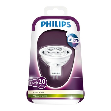 De Philips ledspot GU5.3 4,2W (= 20W) is een halogeenspot geschikt voor een GU5.3 fitting. De spot heeft een vermogen van 4,2 watt, hiermee heeft de spot een lichtopbrengst van 225 lumen. Het heldere, warm witte licht van deze spot heeft een natuurlijke uitstraling waarin de kleuren van je interieur goed tot hun recht komen. De spot creëert gerichte, heldere lichtbanen, waardoor je gemakkelijk lichtaccenten kunt aanbrengen. De spot heeft een lichthoek van 36 graden. De spot heeft puur en elegant ontwerp en een glad oppervlak met een hoogwaardige afwerking. Ook heeft de spot een levensduur van 15000 uur en de spot is ook energiebesparend. De spot schijnt direct met maximale helderheid.