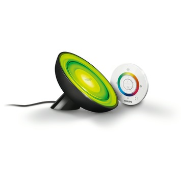 De Philips LivingColors Bloom zwart is een tafellamp met een zwarte afwerking die een gekleurd, diffuus licht verspreidt. De kleur van het licht kan je zelf instellen. Je kan hierbij kiezen uit 16 miljoen kleuren, die je met meer of minder wit licht mengt. Ook kan je de lamp dimmen. Je twee favoriete kleuren kan je opslaan onder een sneltoets. Of druk de knop in en laat de kleuren automatisch veranderen. Met de Philips LivingColors Bloom zwart haal je een trendy lamp in huis voor die nog jaren garant staat voor sfeerverlichting.