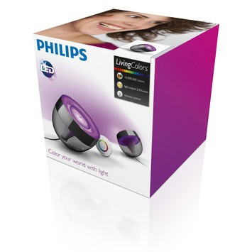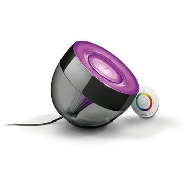 De Philips LivingColors Iris zwart is een tafellamp met een zwarte afwerking die een gekleurd, diffuus licht verspreidt. De kleur van het licht kan je zelf instellen. Je kan hierbij kiezen uit 16 miljoen kleuren, die je met meer of minder wit licht mengt. Ook kan je de lamp dimmen. Je twee favoriete kleuren kan je opslaan onder een sneltoets. Of druk de knop in en laat de kleuren automatisch veranderen. Met de Philips LivingColors Iris zwart haal je een trendy lamp in huis voor die nog jaren garant staat voor sfeerverlichting.