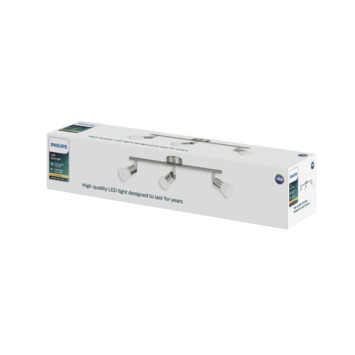 De Philips Opbouwspot Essentials Decagon LED Chroom 3 x 4,3W is een mat chromen lamp in moderne stijl. De spotlamp is dan ook zeer geschikt voor de woon- en slaapkamer met een strak interieur. De spotjes draai- en kantelbaar, en zijn gemaakt van metaal gecombineerd met glas. De geïntegreerde LED's in deze Ledlamp van Philips bieden een zeer lange levensduur van minimaal 15.000 uur. Geschikt voor plafond en wandmontage.