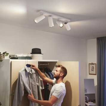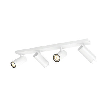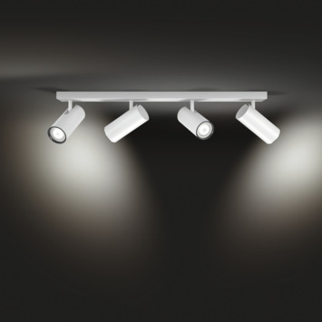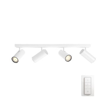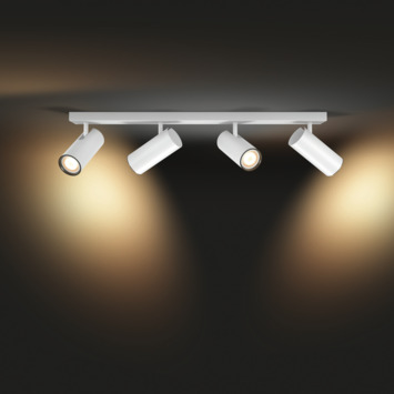 De Philips Hue Buratto opbouwspot bestaat uit een rechthoekige witte montageplaat waarop naast elkaar vier witte spots met White ambiance GU10 LED-lampen zijn gemonteerd. Het warm- tot koelwit licht daarvan kan je helpen ontspannen, lezen, concentreren en energie opdoen. Je kunt de lampen instellen in verschillende lichtstanden, in- en uitschakelen en dimmen met de meegeleverde Philips Hue dimmer switch. Meer slimme functies en verlichtingsmogelijkheden, zoals timers en routines, krijg je ter beschikking als je de Philips Hue Bridge toevoegt aan je verlichtingssysteem. Dan kun je de lampen, zelfs als je van huis bent, ook bedienen via de Philips Hue app.