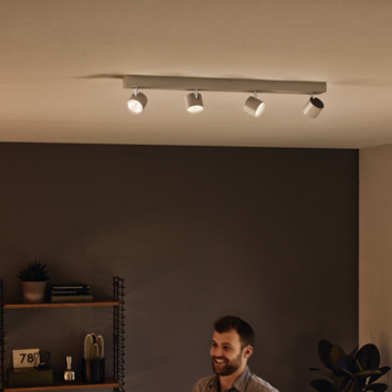 De Philips Star is een witte metalen lamp in een moderne stijl. De spotlamp is dan ook zeer geschikt voor de woon- en slaapkamer met een strak interieur. De LED- lampen zijn richtbaar, waardoor jij zelf kan bepalen waar het licht op gericht moet zijn. Door te dimmen kan je altijd de juiste sfeer aan een kamer geven, hoe meer je de lamp dimt hoe warmer de sfeer wordt. De spots geven een warm wit licht en dankzij de WarmGlow technologie kan je switchen tussen een helder licht om te kunnen concentreren of een warmer licht om lekker te kunnen ontspannen. De montage van de LED spots is erg eenvoudig door het click!Fix- systeem. Hiermee kan je de lamp in 4 stappen eenvoudig installeren. Kortom, met de Philips Opbouwspot MyLiving Star LED Wit 4 x 4.5W heb je altijd de juiste belichting voor het juiste moment.