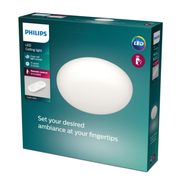 De witte, ronde Philips Toba plafondlamp heeft vier vaste instellingen. Zo kunt u in een oogwenk de sfeer creëren die u wilt. De LED-lamp is te dimmen met de inbegrepen afstandsbediening en kan worden ingesteld om na een uur automatisch uit te schakelen. Zo vergeet u nooit meer het licht uit te doen!
