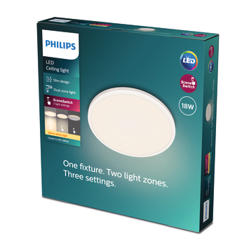 De strakke ronde lijnen van de Ozziet plafondlamp geven je kamer een moderne uitstraling. Deze witte plafondlamp met ultradun ontwerp geeft zowel aan de onderkant als zijkant licht voor een prachtig egaal lichteffect. Met de drie SceneSwitch-lampinstellingen kun je in elke ruimte de perfecte sfeer creëren. Gebruik je bestaande lichtschakelaar om de lamp op 100%, 40% of 10% helderheid in te stellen. De Ozziet plafondlamp ziet er zowel aan als uit mooi uit.