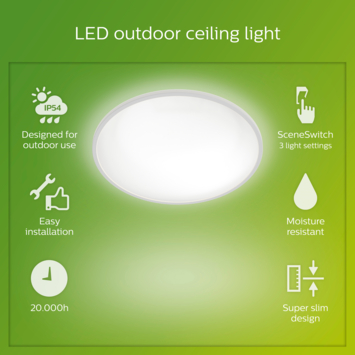 De witte Philips SuperSlim plafondlamp geeft je buitenruimte een moderne uitstraling. Gebruik deze stijlvolle en slanke lamp om je portiek te verlichten met warmwit licht van hoge kwaliteit. Ook zeer geschikt voor de overkapping in de tuin. Door de Philips SceneSwitch functie is de plafondlamp eenvoudig in 3 stappen te dimmen met je standaard lichtschakelaar, en creëer je de door jou gewenste sfeer.