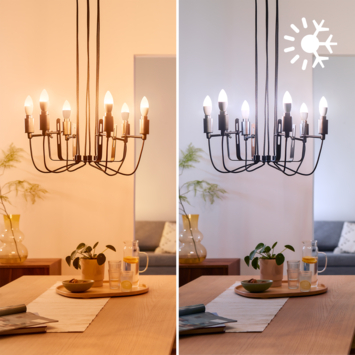 Geef elke ruimte kleur met de prachtige lichttinten van de gekleurde Philips Smart LED kaarslamp met E14-fitting. De lamp is eenvoudig te bedienen via de WiZ app. Zo kun je de lampen gemakkelijk dimmen, feller zetten of één van de voorgeprogrammeerde lichtscènes kiezen. Gebruik ritmes om je lampen op bepaalde tijden automatisch van wittint of kleur te laten veranderen. Je kunt de ritmes naar wens aanpassen door verschillende dynamische lichtscènes te combineren. Wat dacht je van lampen die doen denken aan een kleurrijke herfstdag, een groene jungle of een prachtige oranje zonsondergang? Gemakkelijk te bedienen via je eigen wifinetwerk met de WiZ app of je stem.