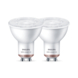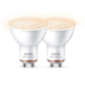 Maak de standaard inbouwlampen en spotjes in je huis slim met de aangename gloed van deze twee Philips Smart LED GU10-spots, die je kunt instellen op elke tint warm- tot koelwit licht. De lampen zijn eenvoudig te bedienen via de WiZ app. Dim de spots, zet ze feller of kies één van de voorgeprogrammeerde lichtscènes. Stel bijvoorbeeld een 24-uurs ritme in en word wakker met koel licht om met wat extra energie aan de dag te beginnen. 's Avonds laat wordt het licht automatisch wat warmer, zodat je lekker ontspannen onder de wol kunt kruipen. Ontdek nog veel meer ritmes en scènes, waar je elke dag wat aan hebt. Gemakkelijk te bedienen via je eigen wifinetwerk met de WiZ app of je stem.