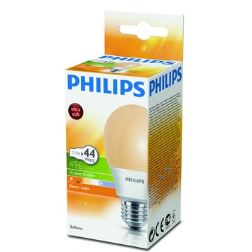 De Philips Softone spaarlamp flame E27 11W (= 44W) is een elegante spaarlamp die geschikt is voor een E27 fitting. Dankzij het gebruik van spaarlamptechnologie heeft deze lamp ondanks het lage energieverbruik een lichtopbrengst van 510 lumen en een vermogen van 11 watt. De warm witte kleur zorgt voor aangenaam warm en natuurlijk licht. Met een levensduur van 8. 000 uur gaat deze lamp lang mee.