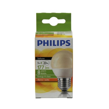De Philips Softone spaarlamp kogel E27 5W (= 20W) is een elegante spaarlamp die geschikt is voor een E27 fitting. Dankzij het gebruik van spaarlamptechnologie heeft deze lamp ondanks het lage energieverbruik een lichtopbrengst van 177 lumen en een vermogen van 5 watt. De warm witte kleur zorgt voor aangenaam warm en natuurlijk licht. Met een levensduur van 8. 000 uur gaat deze lamp lang mee. Deze lamp is per stuk verpakt.