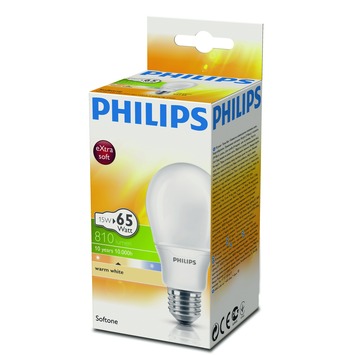 De Philips Softone spaarlamp E27 15W (= 65W) is een spaarlamp die geschikt is voor een E27 fitting. Dankzij het gebruik van spaarlamptechnologie heeft deze lamp ondanks het lage energieverbruik een lichtopbrengst van 895 lumen en een vermogen van 15 watt. De warm witte kleur zorgt voor aangenaam warm en natuurlijk licht. Met een levensduur van 10.000 uur gaat deze lamp lang mee.