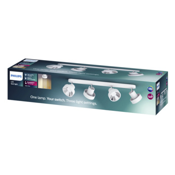 Creëer de perfecte sfeer voor elk moment met de Philips spot Bukko 4-lichts wit. Met een eenvoudige wanddimmer (niet meegeleverd) kun je de lamp in drie verschillende lichtstanden zetten. Van warm sfeerlicht tot helder daglicht om bijvoorbeeld goed te kunnen lezen of werken. Zijn 4 moderne witte spotjes zijn te richten naar de door jou gewenste richting. Zeer handig in een grote ruimte waarbij je extra aandacht wil voor je favoriete schilderij bijvoorbeeld. De Bukko is eenvoudig te installeren aan het plafond door het ClickFix systeem van Philips. In 3 stappen hangt jouw lamp, die zeker 25 jaar mee gaat door zijn geïntegreerde LED. De Bukko is ook te verkrijgen met minder spots en uitgevoerd in de kleur zwart. Bekijk hiervoor ons assortiment Philips lampen.