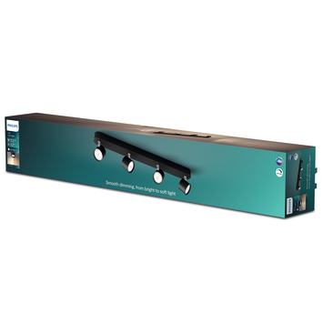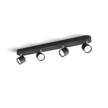 De zwarte Philips Star opbouwspot kan je gemakkelijk dimmen naar het juiste lichtniveau. Zo heb je altijd het juiste licht bij jouw activiteit. Van functioneel helder voor alledaagse taken, naar een zachter licht voor ontspanning. Deze moderne 4-lichts plafondlamp met draaibare spots past in elk interieur.