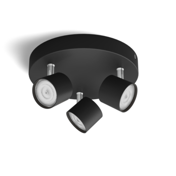 De zwarte Philips Star opbouwspot kan je gemakkelijk dimmen naar het juiste lichtniveau. Zo heb je altijd het juiste licht bij jouw activiteit. Van functioneel helder voor alledaagse taken, naar een zachter licht voor ontspanning. Deze moderne 3-lichts plafondlamp met draaibare spots past in elk interieur.