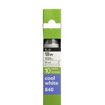 De Philips TL-buis 18 W koel wit is een fluorescentielamp van 18 watt. De lamp is 59 centimeter lang en heeft een lichtopbrengst van 1350 lumen. De kleur is koel wit en de lamp heeft circa 10.000 branduren.