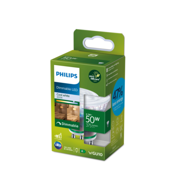 Door je oude conventionele spots te vervangen door Ultra Efficient spots kun je direct veel besparen op je energierekening. Deze Philips Ultra Efficient LED spot verbruikt slechts 2.1W, en vervangt halogeenspots van 50W; een energiebesparing van 95%. Ook in vergelijking met vergelijkbare LED spots verbruikt deze Ultra Efficient LED spot aanzienlijk minder stroom; namelijk zo'n 47% minder. Deze Ultra Efficient LED spots hebben een krachtige lichtbundel met een koelwit licht van 4000K dat ideaal is voor je focusmomenten. Deze Ultra Efficient LED spot is ook nog eens dimbaar, zodat je voor elk moment de juiste hoeveelheid licht kunt kiezen.